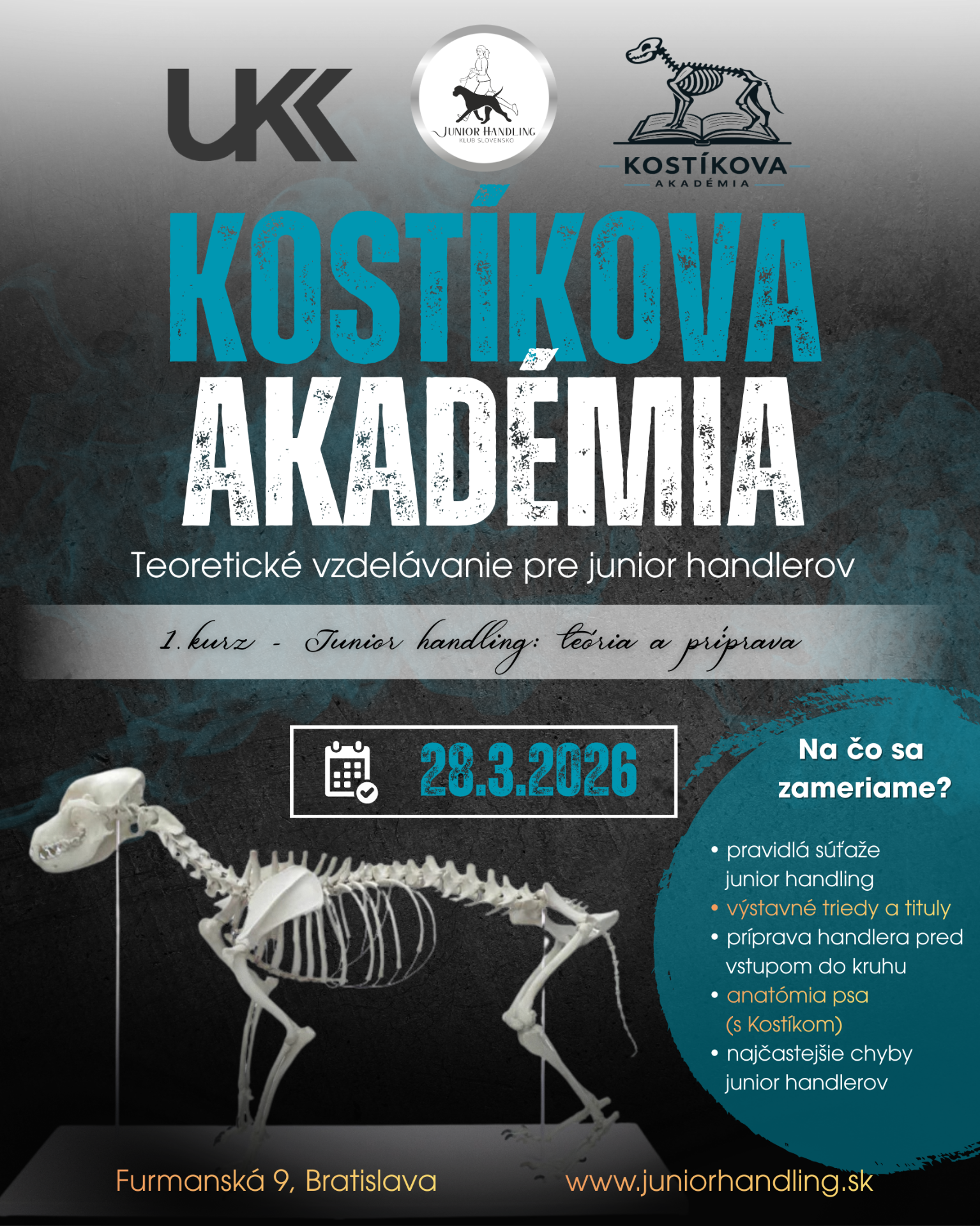 Účastníci sa oboznámia s pravidlami súťaže Junior Handling, výstavnými triedami a titulmi, prípravou handlera pred vstupom do kruhu a najčastejšími chybami v súťaži. Súčasťou kurzu je aj vysvetlenie základov anatómie psa pomocou modelu kostry psa – Kostíka.